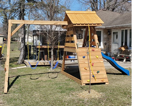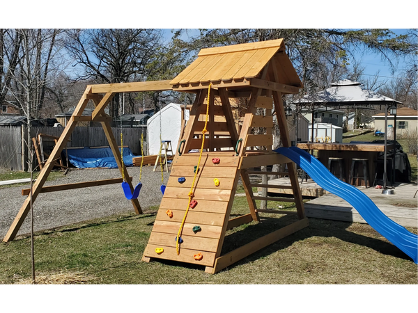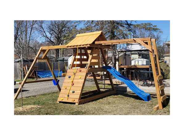 Built to last this set is for younger kids who want to climb, swing and slide! Comes standard with a 4' High Deck, Cute Wood Roof, 2 position Swingbeam, 2 Swings and an 8' Slide. Just $3195.